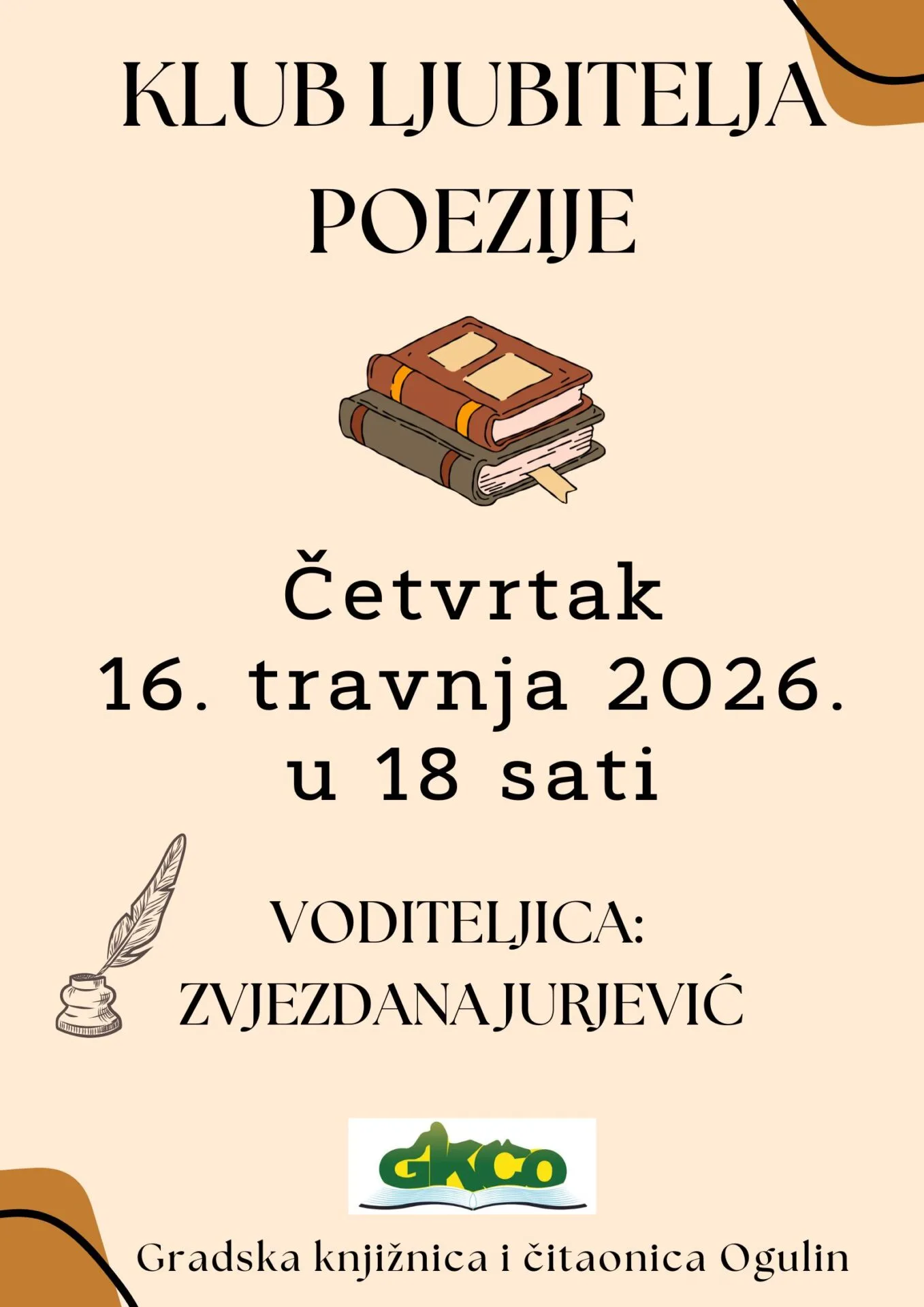Pridružite nam se u četvrtak 16. travnja 2026. u 18 sati u Maloj dvorani Gradske knjižnice i čitaonice Ogulin na 29. susretu Kluba ljubitelja poezije koji vodi gospođa Zvjezdana Jurjević, velika ljubiteljica pisane i izgovorene pjesničke riječi.