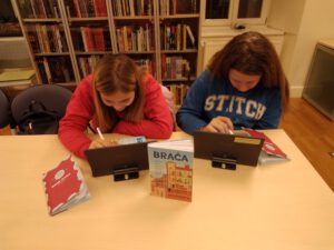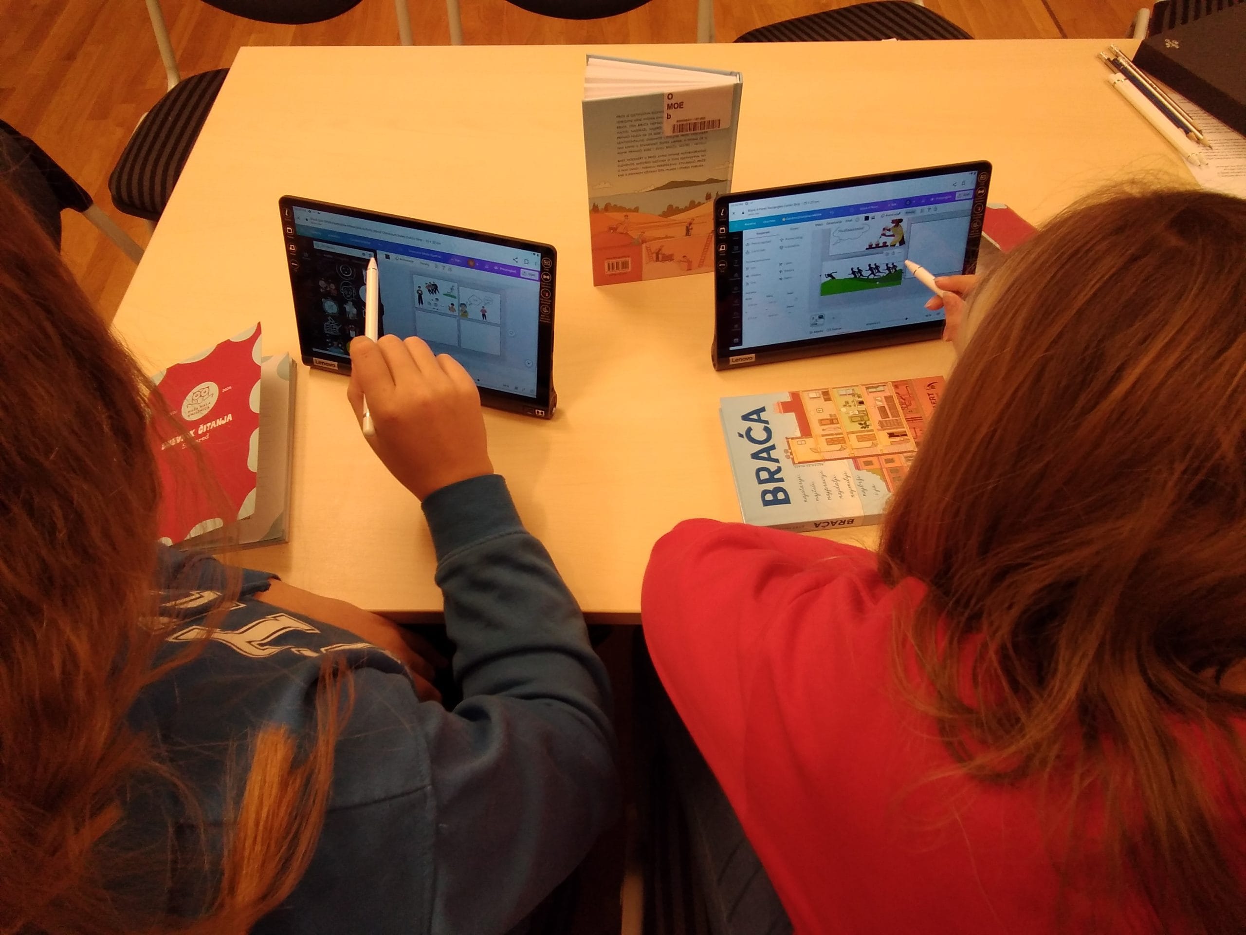 Knjiga koju čitamo ovaj mjesec nosi naslov Braća autora Barta Moeyaerta. Autobiografska zbirka priča iz djetinjstva o sedmorici braće koje priča najmlađi brat. Nakon upoznavanja sa sažetkom knjige i pročitane priče “Konjski kolač” polaznice su se upoznale s internetskim alatom Canva s kojim će izraditi strip. Druženje s knjigom i izradom stripa nastavit će se na sljedeća dva susreta.