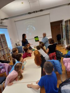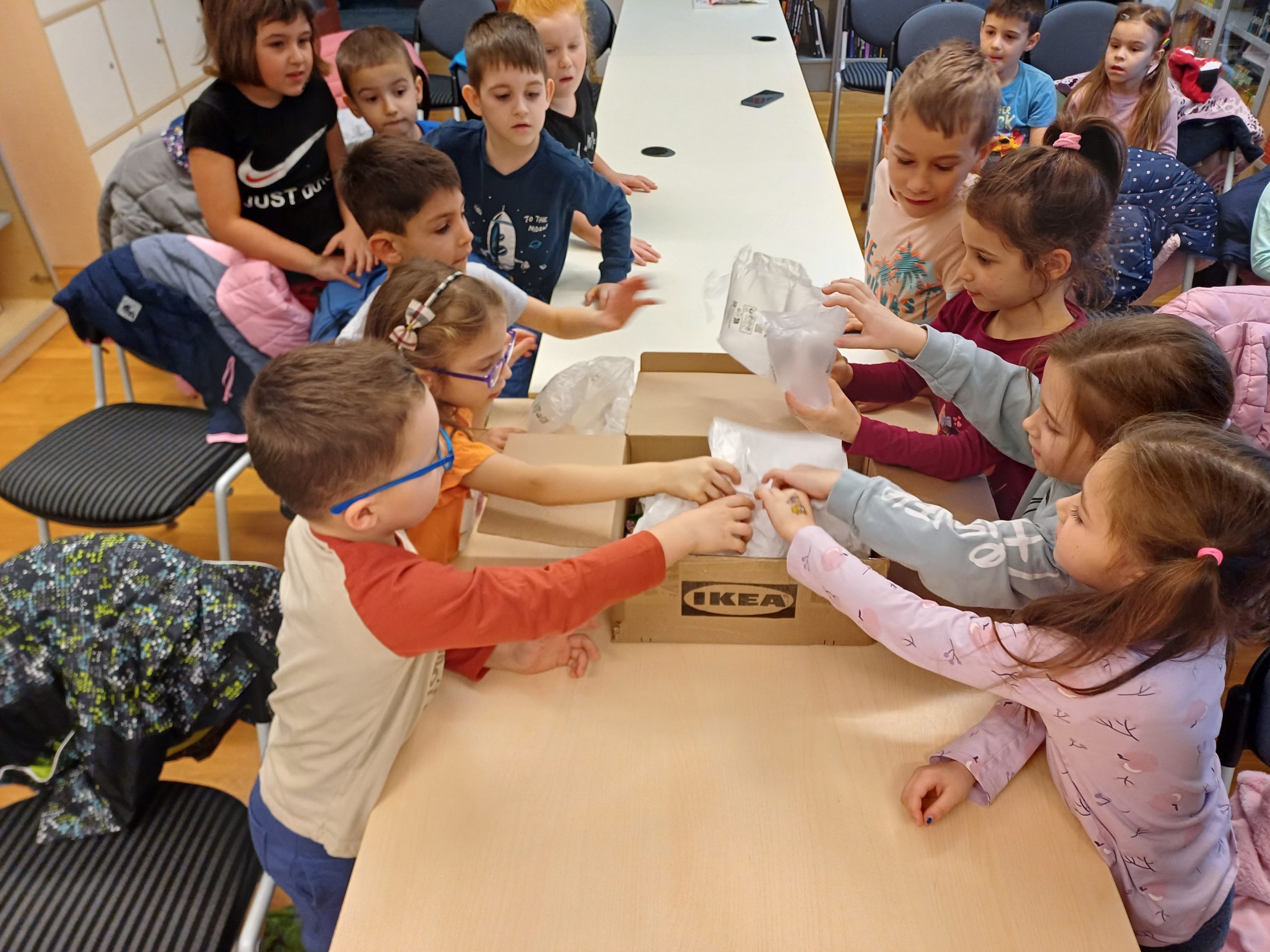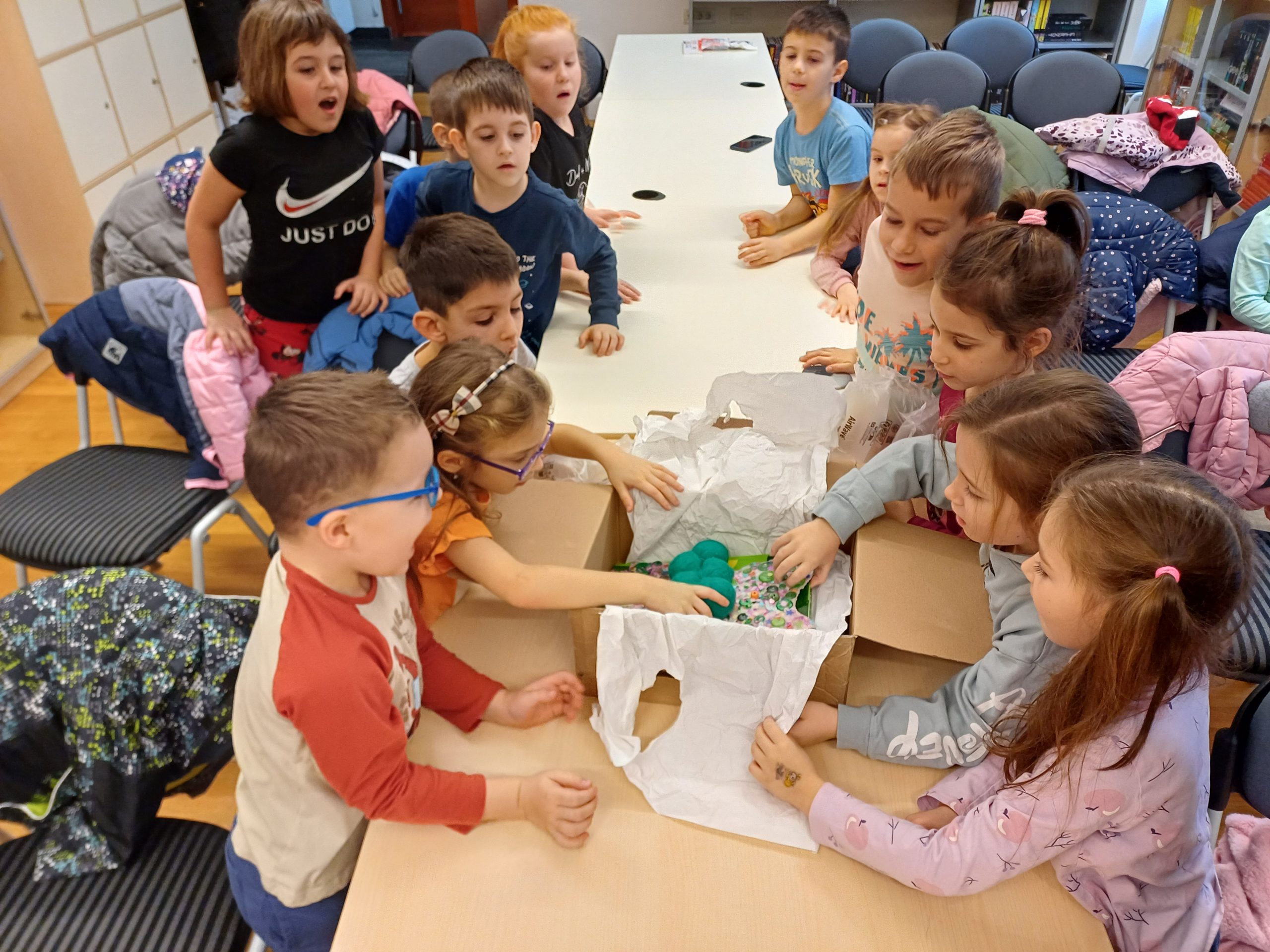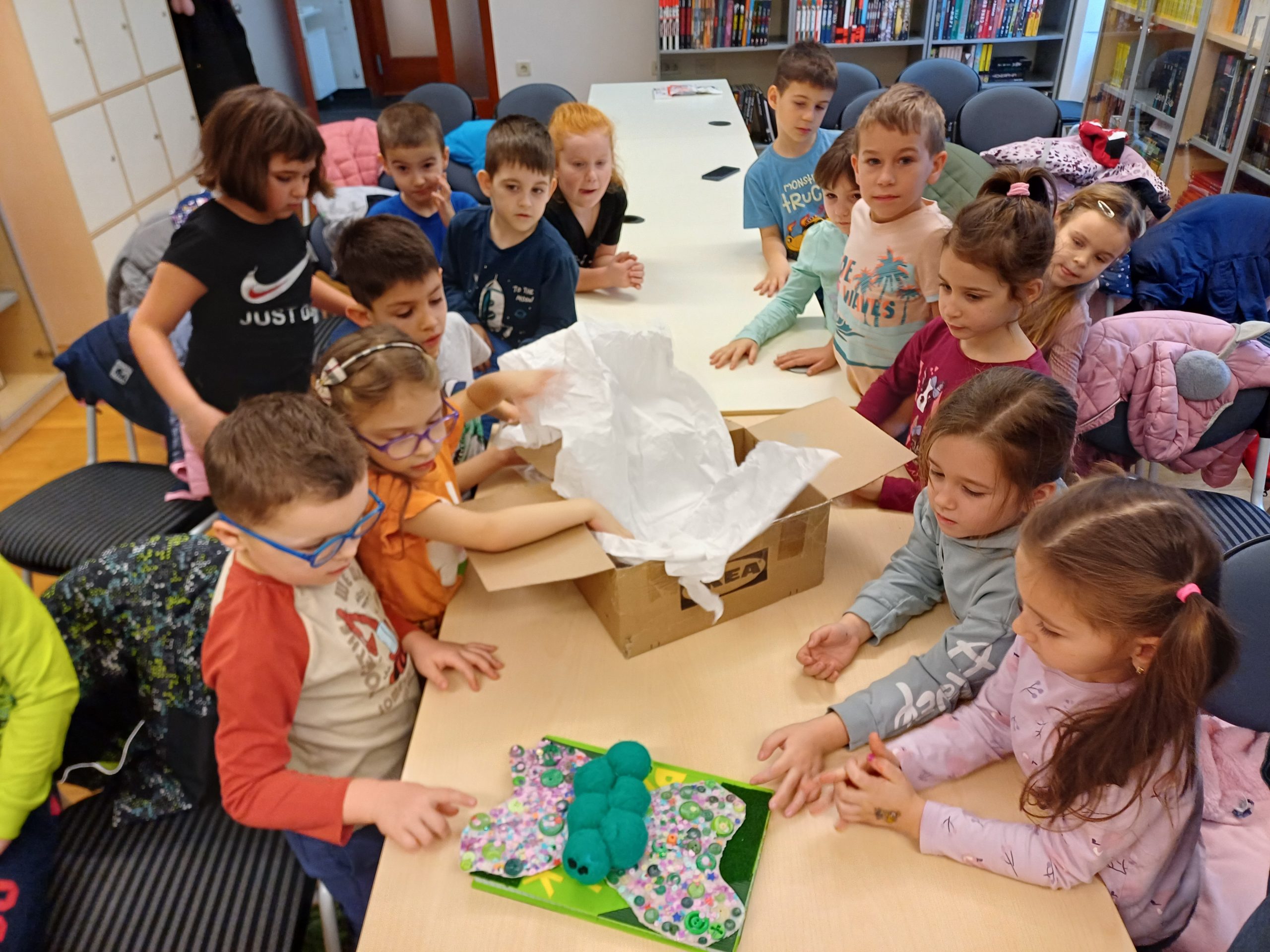 Na današnjem susretu Naše male knjižnice s djecom vrtićke skupine Ribice, posebnu radost donijela je kutija iznenađenja koju su poslali mali prijatelji iz DV Dječji svijet iz Varaždina. U paketu je pristigao knjižni junak Buba.