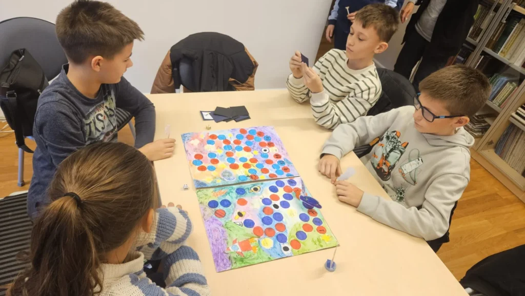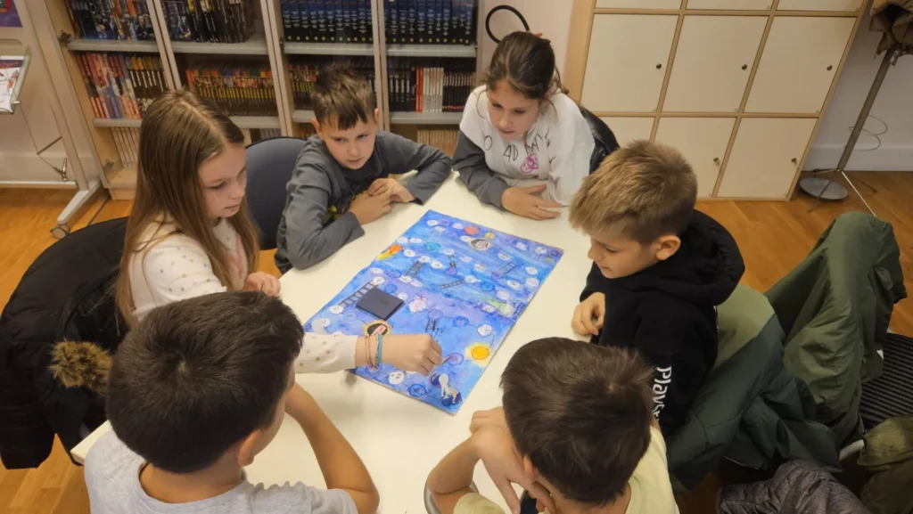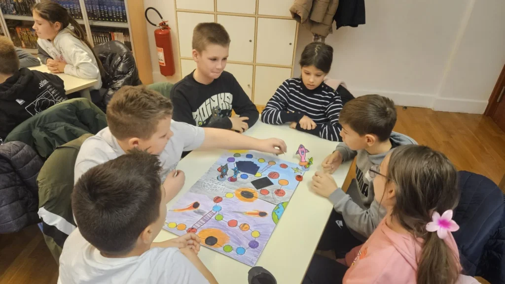 Danas smo završili sa nagradnim zadatkom i odigrali svemirsku verziju igre „Čovječe, ne ljuti se“. U igri su se susreli svemirski brodovi, galaksije i vanzemaljci, a cilj je bio ne samo doći do cilja, nego i otkriti tajne svemira. Osim toga, izradili smo posebne kartice s pitanjima i zadacima koji igrače vode kroz galaksiju. Jedna od kartica, na primjer, je „Crna rupa“, koja igraču nalaže da preskoči iduće bacanje – prava svemirska opasnost!