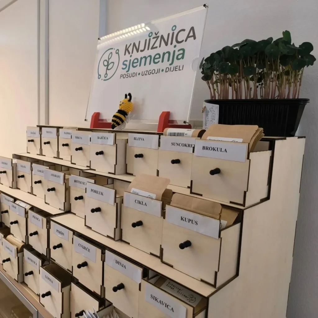 57 sjemenskih kultura, od kojih je sazdana novootvorena Knjižnica sjemenja, rezultat su bogatih donacija sjemenja naših sugrađana donatora: Marinka Sabljaka (Agro Spraja d.o.o.), Aleksandre i Alena Puškarića (Mikro meni), Dunje Turković (Crna potkova), Zrinke Jezdić AromaVita Institut Za Aromaterapiju ,Mariane Domitrović i Mirele Salopek Brozović.