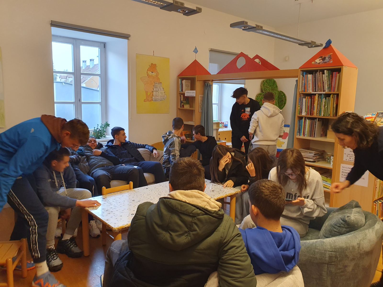 Učenike smo proveli kroz cijelu knjižnicu, a zatim su u maloj dvorani knjižnice pogledali izložbu starih izdanja Matice hrvatske.