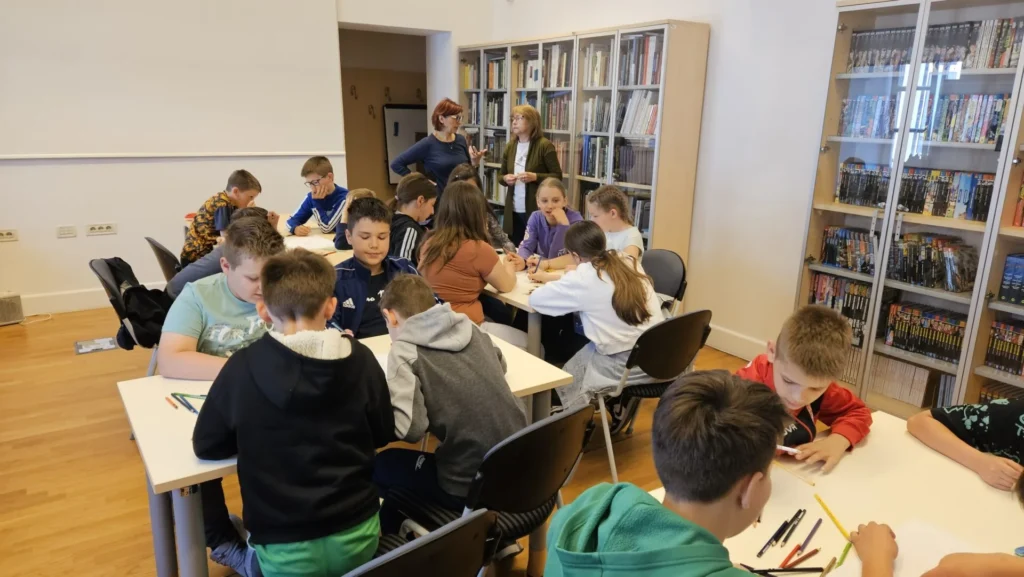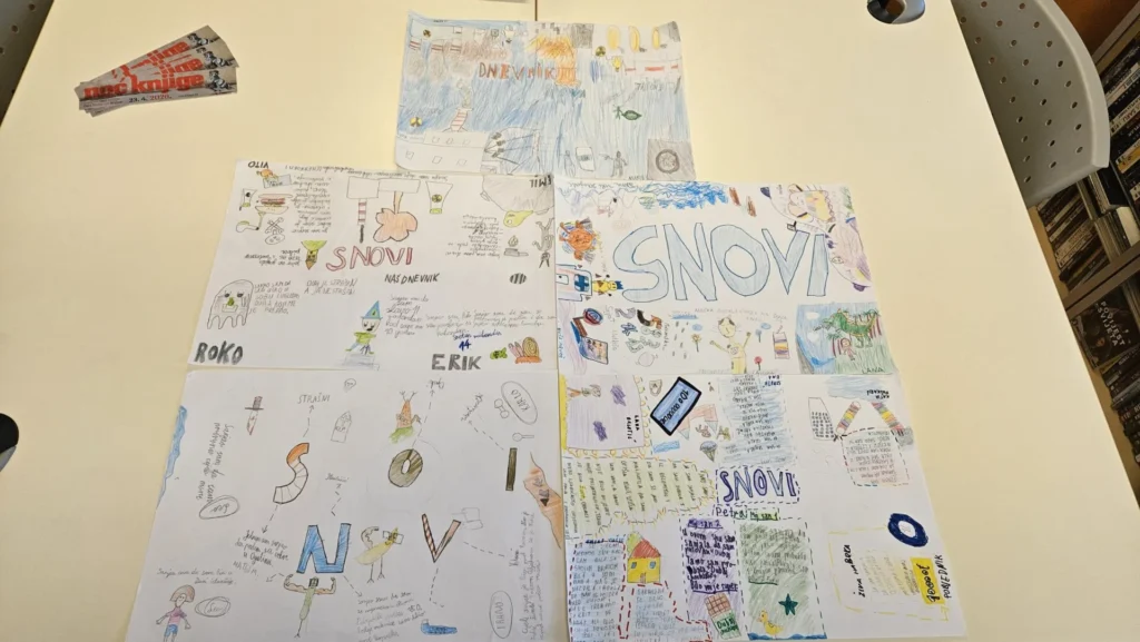 Današnja radionica posvećena je obilježavanju manifestacije Noć knjige. Započeli smo ju tako što smo čitali doživljaje iz dnevnika našeg knjižnog junaka Kape koji je bio na izletu kod prijatelja u Varaždinu. Kapo je svašta radio; pisao domaću zadaću, rješavao ispite, jeo ćufte i sladoled, svirao gitaru i još dosta toga. Nakon toga smo izrađivali dnevnike snova u grupama. Svakakvih je tu snova bilo, ružnih i lijepih. Neki su sanjali da su lik iz crtića “Dora istražuje”, član nogometne momčadi, pretvoreni u puža i patku, utapanje u moru, putovanje u Dubai, dobitak na lotu… Zaključili smo da snovi mogu biti jako nepovezani i čudni, ponekad jako strašni, ali ipak su to samo snovi.